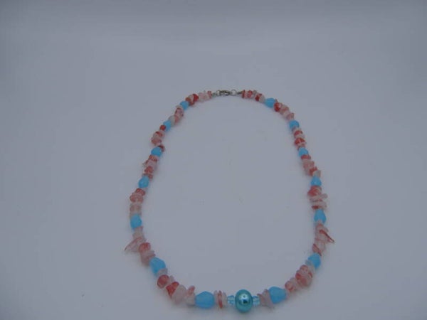 Gemaakt van licht blauw glaskralen met wit/roze natuursteentjes.